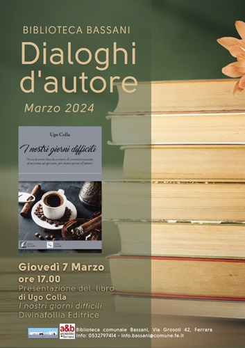 FERRARA – Sarà dedicato al libro “I nostri giorni difficili” di Ugo Colla il nuovo appuntamento, giovedì 7 marzo 2024 alle 17, con “Dialoghi d’autore” nella sala auditorium della biblioteca comunale Bassani di via Grosoli 42 (Barco, Ferrara).