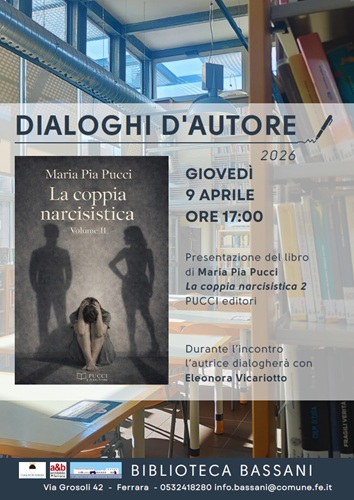 FERRARA – Sarà dedicato al tema delle relazioni e delle dinamiche affettive complesse l’appuntamento con “Dialoghi d’autore” in programma giovedì 9 aprile 2026 alle 17:00 alla biblioteca comunale Bassani (via Grosoli 42, Barco, Ferrara). Protagonista dell’incontro sarà Maria Pia Pucci, autrice del libro ‘La coppia narcisistica 2’.