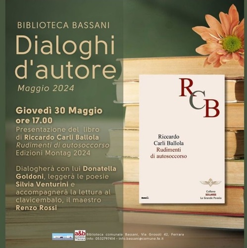 FERRARA – Sarà lo scrittore e poeta comacchiese Riccardo Carli Ballola, con la sua ultima raccolta di poesie “Rudimenti di autosoccorso” (Edizioni Montag, 2024), il protagonista, giovedì 30 maggio 2024 alle 17, del nuovo appuntamento con il ciclo “Dialoghi d’autore” alla biblioteca comunale Bassani (via Grosoli 42, Barco, Ferrara).