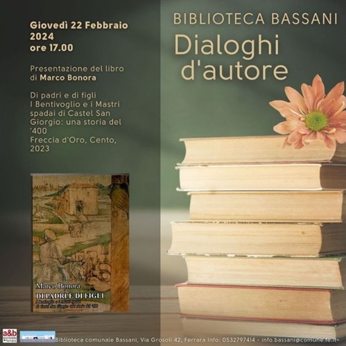 FERRARA – Sarà lo scrittore Marco Bonora il protagonista, giovedì 22 febbraio 2024 alle 17, del nuovo appuntamento con “Dialoghi d’autore” nella sala auditorium della biblioteca comunale Bassani di via Grosoli 42 (Barco, Ferrara). L’autore presenterà il suo libro storico “Di padri e di figli. I Bentivoglio e i Mastri spadai di Castel San Giorgio: una storia del ‘400”. Dialogherà con l’autore Gian Paolo Borghi, coordinatore scientifico del MAF.