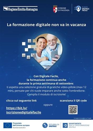 PIACENZA – Sarà ancora disponibile anche nella prima settimana di settembre, il corso gratuito online dal titolo “La formazione digitale non va in vacanza”, attivato per il mese di agosto in concomitanza con il periodo di chiusura estiva degli sportelli “Digitale Facile”, dislocati nei diversi spazi cittadini messi a disposizione dal Comune di Piacenza nell’ambito del progetto Digitale Facile in Emilia-Romagna, promosso dalla Regione e finanziato con fondi PNRR – Next Generation EU, realizzato in coprogettazione con il Consorzio Sol.Co.