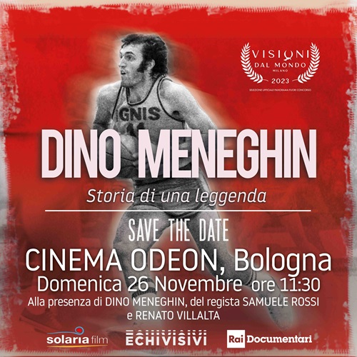 BOLOGNA – Il nuovo film documentario di Samuele Rossi DINO MENEGHIN Storia di una leggenda che porta per la prima volta sullo schermo la vita di una delle più grandi leggende dello sport italiano, sarà proiettato all’interno di un evento speciale domenica 26 novembre alle ore 11.30 al Cinema Odeon di Bologna, organizzato con la collaborazione di LBA – Lega Basket Serie A e FIP – Federazione Pallacanestro Italia Comitato Regionale Emilia-Romagna.