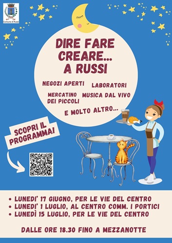 RUSSI (RA) – «Dire, Fare, Creare» è la nuova iniziativa promossa dal Comune di Russi in collaborazione con i titolari degli esercizi commerciali per invitare i russiani a trascorrere le sere estive nel cuore della città, all’insegna dello shopping e del divertimento. Per tre lunedì, dalle ore 18.30 fino a mezzanotte, il programma prevede negozi aperti, laboratori, degustazioni, dimostrazioni, esposizioni, mercatini, musica dal vivo e tante altre proposte di svago per grandi e piccini. Il 17 giugno e 15 luglio i riflettori si accenderanno sul centro (Piazza Farini, Piazza Dante, Corso Farini ecc…), mentre il 1° luglio la scena si sposterà al Centro commerciale I Portici, in via Godo Vecchia.