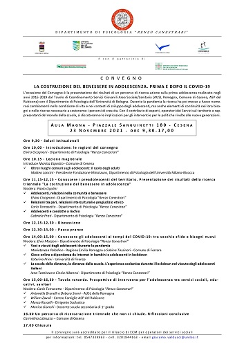 A questa tre giorni farà seguito martedì 23 novembre una intera giornata dedicata all’adolescenza che si terrà nell’Aula Magna del Dipartimento di Psicologia (Piazzale Sanguinetti, 180) dalle 9,30 alle 17. L’occasione del convegno è la presentazione dei risultati di un percorso di ricerca-azione sulla prima adolescenza realizzato negli anni 2016-2019 dal Tavolo di Coordinamento Servizi Giovanili Area Sociale/Sanitaria (AUSL Romagna, Comune di Cesena, ASP del Rubicone) con il Dipartimento di Psicologia dell’Università di Bologna. Durante la pandemia la ricerca ha poi messo a fuoco numerosi cambiamenti nella condizione di vita e nei contesti di sviluppo degli adolescenti, ma anche elementi di continuità nei loro bisogni e nelle risorse necessarie a sostenerne i percorsi di crescita. Con il contributo di esperti, operatori dei Servizi sul territorio e rappresentanti del mondo della scuola, si discuteranno le implicazioni per gli interventi e per le politiche rivolte alle nuove generazioni.