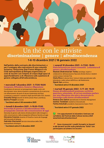 BOLOGNA – Inizia mercoledì 1 dicembre il ciclo di quattro incontri online “Un thé con le attiviste”, organizzato da Città metropolitana di Bologna e Istituzione Gian Franco Minguzzi nell’ambito delle attività di contrasto alle discriminazioni e per il sostegno alla costruzione di una comunità inclusiva.