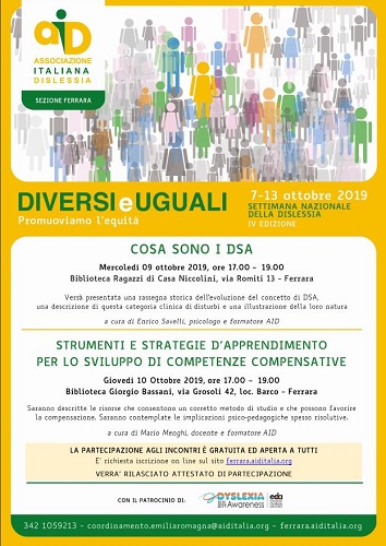 Si tratta di un incontro con partecipazione gratuita e aperta a chiunque interessato, con riconoscimento formativo per insegnanti ai quali verrà rilasciato l’attestato per docenti. L’iniziativa rientra nella “Settimana Nazionale della Dislessia”, organizzata dal 7 al 13 ottobre a cura di AID-Associazione Italiana Dislessia, la quarta edizione della Settimana Nazionale Dislessia in concomitanza con la European Dyslexia Awareness Week, promossa dalla European dyslexia association (Eda). Quest’anno il tema scelto è “diversi e uguali, promuoviamo l’equità”.
