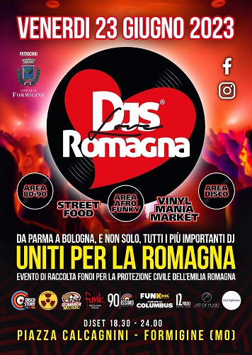 La serata realizzata con il patrocinio del Comune di Formigine, e’ organizzata da Fabrizio Zanni, Paolo Fava, Andrea Castagnini, con il contributo de “ I Ragazzi del Columbus” e dell Associazione 12 Pollici Social Club di Lugo”, anch’essa alluvionata ”. L’evento e’ gemellato con DJ Forever (Djs Uniti per Emilia Romagna ) dei Djs Veneti promosso dal Dj Claudio Stella. Un ringraziamento speciale a tutti i djs che daranno il loro contributo.