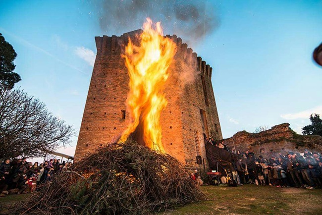 L’atmosfera magica dei Lòm a Mêrz inizierà a riempire l’aria alle ore 17.45 con il calar del sole; alle ore 18 sarà acceso il grande falò nel quale saranno bruciati simbolicamente, insieme a rami secchi e resti delle potature, i freddi e le fatiche dell’inverno, invocando con il tradizionale scongiuro propiziatorio una primavera benevola per la campagna. Attorno al fuoco, scaldati dalle fiamme e da un goloso brulè, andranno in scena canti e balli della tradizione romagnola.