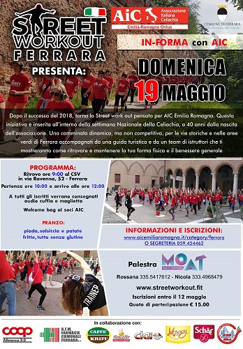 FERRARA – In occasione della Settimana Nazionale della Celiachia, domenica 19 maggio l’Associazione Italiana Celiachia Emilia Romagna Onlus (AICER) invita la cittadinanza interessata a “In-Forma con AIC”, camminata non competitiva attraverso le vie di Ferrara, con guida turistica e soste energizzanti.