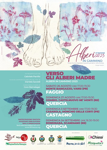 “Una terra per viverci”: così amava dire il poeta Attilio Bertolucci di Casarola, suo luogo affettivo, e i suoi versi -insieme a quelli di altri poeti che si sono ispirati alla natura dell’appennino- riecheggeranno fra i boschi di castagno: Bertolucci e Caproni, accanto a Ovidio, Shakespeare, Tasso, Hesse, e poeti contemporanei come Gualtieri. Parole, musica e danza portate al cospetto degli alberi madre da Gabriele Parrillo, regista e interprete di Alberi in cammino, Daniela Savoldi, violoncellista e compositrice che eseguirà dal vivo le musiche, e Cora Steinsleger che ha ideato coreografie e danze.