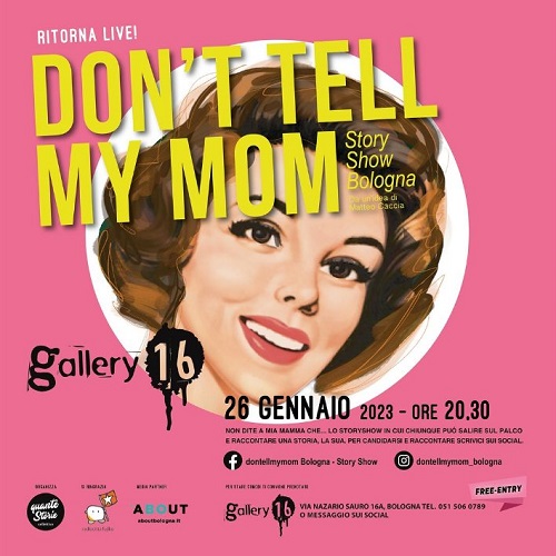 BOLOGNA – Torna live a Bologna “Don’t tell my mom – Story Show” storie vere da non raccontare alla mamma. Il primo appuntamento è in programma giovedì 26 gennaio ore 20.30 da Gallery16 in via Nazario Sauro, 16/a, a Bologna.