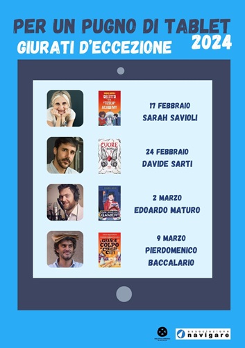 Sabato 17, alle 15, invece, riflettori puntati sulla prima “puntata” della decima edizione di “Per un pugno di tablet”. Da una felice intuizione dei professori Giancarlo Messina e Antonella Mascilongo dell’Associazione Navigare di Cattolica, si è creata una collaborazione ludico-professionale tra la Biblioteca e le scuole secondarie di primo grado del territorio, finalizzata a mettere la lettura al centro di un incontro tra Scuola, Biblioteca, ragazzi e genitori con finalità culturali, ludiche ma anche educative e di socializzazione.