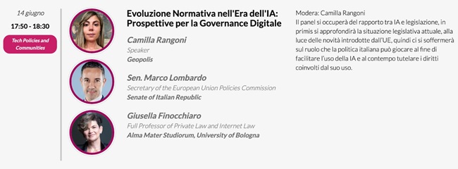 Venerdì 14 giugno ore 17.50 Presentazione libro “Intelligenza artificiale. Quali regole?” con Giusella Finocchiaro e Senatore Marco Lombardo.