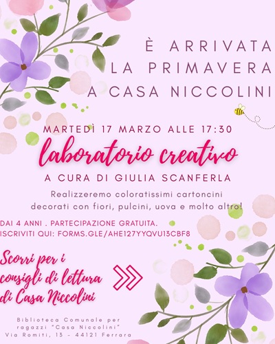 FERRARA – È arrivata la primavera con i suoi colori, fiori e profumi alla biblioteca comunale Casa Niccolini (via Romiti 13, Ferrara). Per celebrarla, martedì 17 marzo 2026 alle 17:30 si terrà un laboratorio creativo per bambine e bambini dai 4 anni per realizzare cartoncini decorati a tema.