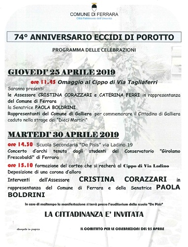 – alle ore 11.45 verrà reso l’omaggio al cippo di via Tagliaferri: saranno presenti le assessore alla Pubblica Istruzione e all’Ambiente del Comune di Ferrara, la senatrice ferrarese Boldrini e rappresentanti del Comune di Galliera (per commemorare il cittadino di Galliera caduto nella strage dei “Dieci Martiri”).