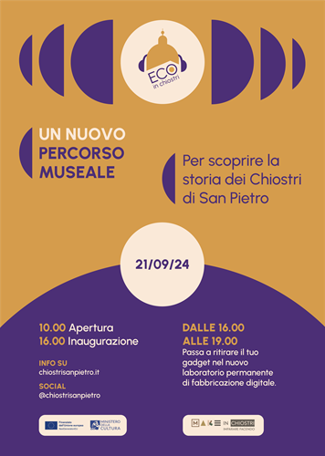 “ECO IN CHIOSTRI”, adatto a tutte le età, ripercorre la storia dei Chiostri di San Pietro attraverso le diverse epoche e i molteplici utilizzi che i Chiostri hanno avuto nel corso dei secoli.