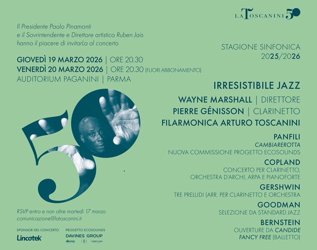 PARMA – La Stagione Sinfonica della Filarmonica Arturo Toscanini prosegue all’Auditorium Paganini di Parma con due concerti in programma giovedì 19 marzo (ore 20.30) e venerdì 20 marzo (ore 20.30, concerto fuori abbonamento), affidati alla direzione di Wayne Marshall e con Pierre Génisson al clarinetto. Intitolato “Irresistibile Jazz”, il concerto attraversa l’immaginario musicale americano del Novecento, mettendo in dialogo musica sinfonica, jazz e nuova creazione contemporanea. Il concerto è sostenuto da Lincotek e si inserisce nel progetto “Ecosounds – La Natura suona”, realizzato in collaborazione con Gruppo Davines, che affianca la Stagione con nuove commissioni dedicate al tema del rapporto tra uomo, ambiente e responsabilità civile.