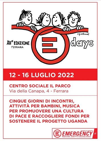 LA SCHEDA a cura degli organizzatori – Cinque giorni di incontri e approfondimenti su alcuni dei temi più attuali del momento, il tutto arricchito da musica, attività per i bambini e buon cibo con lo scopo di promuovere una cultura di pace, di rispetto dei diritti umani e raccogliere fondi per sostenere il Centro di eccellenza in chirurgia pediatrica di Emergency in Uganda. Tornano dal 12 al 16 luglio 2022 con la XII edizione gli Emergency days: un appuntamento diventato ormai un punto di riferimento per le estati ferraresi. La location scelta per l’edizione 2022 sarà il centro sociale Il Parco in via della Canapa 4, una posizione suggestiva immersa nel verde del parco Bassani e adiacente alle Mura cittadine. Rimarrà invariata rispetto alle altre edizioni la programmazione delle attività delle cinque giornate: a partire dalle ore 18:30 si svolgeranno gli incontri pubblici che riguarderanno diverse tematiche tra le quali l’importanza del diritto alla salute, la crisi energetica e ambientale, i traumi della guerra, il ricordo del fondatore e anima di EMERGENCY Gino Strada con la presentazione del libro “Una persona alla volta” e il coraggio delle idee in contesti difficili e pericolosi. Non mancherà sempre nel pomeriggio lo spazio bimbi: laboratori e giochi che permetteranno ai più piccoli di divertirsi imparando. Dalle ore 19.30 sempre per i bambini “Giochiamo in pace” insieme alle volontarie e volontari del gruppo EMERGENCY di Ferrara verrà allestito uno spazio in cui svolgere piccoli lavoretti, giochi e leggere libri insieme. Gli Edays 2022 saranno anche all’insegna dello spettacolo e della musica che vedrà ogni sera, come consuetudine della manifestazione, salire sul palco diverse band che faranno ballare il pubblico presente. Attivo anche quest’anno lo stand gastronomico; un punto ristoro gestito dal circolo Arci Bolognesi in collaborazione con i volontari di EMERGENCY dove si potranno gustare ottime pietanze o bere una buona birra in compagnia. Mercoledì 13 luglio il servizio sarà svolto in cooperazione con i ragazzi dell’Associazione Casa e Lavoro (nata nel 2011 con l’obiettivo di promuovere progettualità di vita per persone con disabilità). Tutti i giorni presente la libreria tematica per grandi e piccini in collaborazione con Librerie.coop e il negozio di EMERGENCY dove sarà possibile ricevere tutte le informazioni per approfondire le attività dell’associazione e acquistare gadget. All’Infopoint si potrà provare l’esperienza della realtà virtuale indossando i visori a 360° per visitare i progetti di EMERGENCY in Afghanistan. Il ricavato della manifestazione contribuirà a finanziare il progetto del Centro di eccellenza in chirurgia pediatrica di EMERGENCY a Entebbe in Uganda: una struttura sostenibile e di eccellenza aperta nel 2021 che offre cure gratuite e di qualità. Un altro punto fondamentale è la tutela dell’ambiente e per questa ragione gli Emergency days 2022 saranno contrassegnati dal Plastic Free. Per maggiori informazioni sull’iniziativa: https://emergencydaysferrara.wordpress.com, Tel 333 9940136, ferrara@volontari.emergency.it