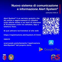 Si ricorda inoltre che nel Comune di Rimini è attivo il servizio gratuito Alert System via cellulare, App o telefono fisso e si può attivare iscrivendosi al sito web (https://registrazione.alertsystem.it/rimini) oppure scaricando gratuitamente l’applicazione Alert System dal proprio store. Si consiglia di attivare sia la funzione web che di scaricare la app.