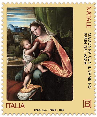 Completano il francobollo le leggende “MADONNA CON IL BAMBINO”, “PERIN DEL VAGA” e “NATALE” la scritta “ITALIA” e l’indicazione tariffaria “B”.