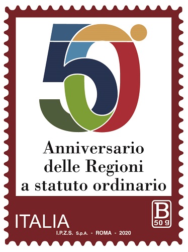 Completano il francobollo la leggenda “ANNIVERSARIO DELLE REGIONI A STATUTO ORDINARIO”, la scritta “ITALIA” e l’indicazione tariffaria “B 50 g”.