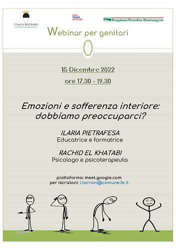 FERRARA – “Emozioni e sofferenza interiore: dobbiamo preoccuparci?” è il titolo del terzo appuntamento dei webinar per i genitori organizzati dall’Osservatorio Adolescenti del Comune di Ferrara in collaborazione con l’Assessorato alle Politiche Giovanili, in programma giovedì 15 dicembre 2022 dalle 17.30 alle 19.30.