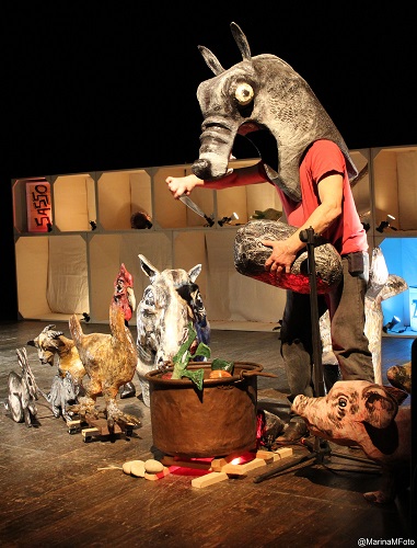 In questa versione teatrale della fiaba, il posto dei personaggi umani viene preso da animali che simboleggiano differenti psicologie e attitudini: un vecchio lupo, ormai non più cacciatore, poi, galline, maiali, pecore, capre, cavalli, asini, cani, portano a turno vari ingredienti e infine si ritrovano attorno ad un camino in un convivio festoso. Non è infatti tanto nella figura del protagonista, umano o animale che sia, da ricercare il significato o la morale della storia, quanto in quello che questa figura è in grado di lasciare nei personaggi che restano. Ne sono trasformati, riscoprono sentimenti di unione, amicizia, felicità, leggerezza, che avevano dimenticato, abbandonato. L’attore attraverso l’utilizzo di oggetti e maschere interpreterà i differenti personaggi e li condurrà verso la festosa cena finale.