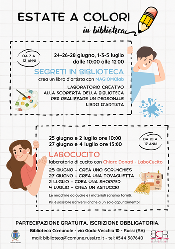 RUSSI (RA) – “Segreti in biblioteca” e “LaboCucito” sono i titoli dei laboratori gratuiti per bambini e ragazzi facenti parte del progetto “Estate a colori in biblioteca”, che avrà luogo presso la Biblioteca Comunale di Russi, in via Godo Vecchia 10, dal 24 giugno al 5 luglio 2024.