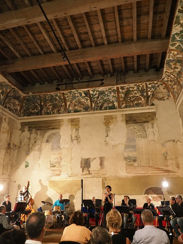 VOGHIERA (FE) – Col concerto jazz di domenica 28 agosto, nella magnifica cornice della Sala delle vigne del Belriguardo, è terminata la prima parte di questa edizione di “Estate al Belriguardo”. Grande il successo di pubblico fin dalla prima serata – “Un’entrata Classica”, nel giardino della Delizia – poi proseguito nella location della Delizia “Ai Tre Tesori” col concerto funk e fusion di Askar Group e infine fattosi colorato ed entusiasmante in concomitanza col Vespa raduno di “Raduno in musica”. Dunque una stagione da ricordare con un arrivederci al suono del jazz, magicamente interpretato dalla voce di Francesca Marchi e dal Quartet Jazz di cui fa parte (con Lele Barbieri alla batteria, Corrado Calessi al pianoforte, Leonardo Scarpante al basso e per l’occasione Filippo Cavalieri alla chitarra), a completare la serata i musicisti di Bandzai Sax Quartet (Gabriele Cesari al soprano, Antonio Sovrani al contralto, Stefano Mandrioli al tenore, Massimiliano Cobianchi al baritono). Ovviamente l’acustica della Sala delle vigne – ambitissima da molti musicisti – ha reso spettacolare l’esibizione. Pubblico numeroso e attento, non è mancato il saluto istituzionale del sindaco Paolo Lupini e dell’assessore alla cultura Emanuele Ganzaroli, assessore che, assieme alla Filarmonica di Voghenza, si è occupato di questa nuova edizione di concerti estivi al Belriguardo. Serata jazzistica di alto livello, vale la pena sottolineare la presenza di Lele Barbieri alla batteria, musicista conosciutissimo in Italia e all’estero, vanto del Conservatorio ferrarese. Questa del 2019 è la prima edizione di “Estate al Belriguardo” priva della conduzione del maestro Domenico Urbinati, che per questioni lavorative ha dovuto anche lasciare la direzione della banda. I giovani della filarmonica hanno raccolto la sfida e si sono cimentati nell’organizzazione della manifestazione, come sempre in stretta sinergia col Comune di Voghiera. Ora la rassegna va in pausa per poi riprendere di slancio venerdì 30 agosto alle 21, ancora nella Sala delle vigne del Belriguardo. Andranno in scena i musicisti di Ebony Wind, ensemble di clarinettisti ferraresi che proporrà un percorso musicale e storico in una serata dal titolo “All’epoca del clarinetto”.