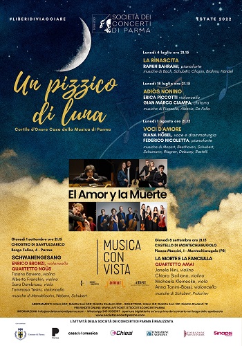 PARMA – Musica sotto le stelle con la Società dei Concerti di Parma che in collaborazione con l’Assessorato alla Cultura del Comune di Parma-Casa della Musica, per l’estate 2022 propone cinque concerti in luoghi particolarmente suggestivi della città e dintorni, con grandi interpreti del panorama internazionale. Suddivisi in due serie, Un pizzico di luna (4 luglio-1 agosto) e Musica con vista (1-8 settembre, con inizio sempre alle 21.15), gli appuntamenti compongono un unico cartellone intitolato El Amor y la Muerte per riflettere su ciò che purtroppo sta accadendo nel mondo e per contrapporre l’amore per la bellezza, la cultura e l’arte come baluardo alle follie dell’umanità.