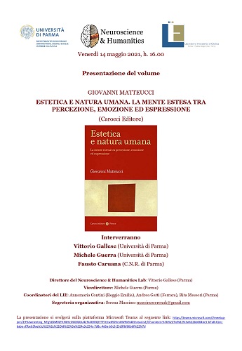 PARMA – Un nuovo appuntamento venerdì 14 maggio per presentare e discutere da più prospettive testi recentemente pubblicati su immagini, arte, cinema ed estetica. Alle 16 su Teams è la volta del volume del docente all’Università di Bologna Giovanni Matteucci Estetica e natura umana. La mente estesa tra percezione, emozione ed espressione; oltre all’autore parteciperanno i docenti dell’Università di Parma Vittorio Gallese e Michele Guerra e Fausto Caruana del CNR di Parma.