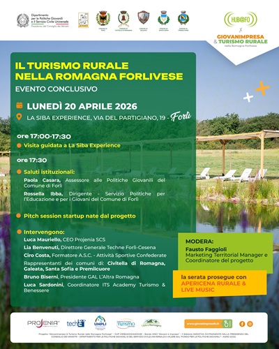 FORLÌ – C’è un momento in cui i progetti smettono di essere idee e diventano storie reali. È questo lospirito che accompagnerà l’evento conclusivo di “Giovanimpresa & Turismo Rurale nella Romagna Forlivese”, in programma lunedì 20 aprile 2026, presso La Siba Experience, nel cuore della natura forlivese.Un appuntamento che non è solo una chiusura, ma un nuovo inizio: quello di giovani imprenditori che hanno scelto di investire nel territorio, nella sua autenticità e nella sua capacità di generare futuro.