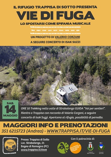 Dopo un trekking di 6 km accompagnati dalla guida Aigae Jessica Francesconi ascolteremo al rifugio “vie di fuga” una serie di storie avvincenti che conciliano l’afflato nomade con la ricerca musicale. Questo progetto di Valerio Corzani musicista, autore e conduttore radiofonico, giornalista e fotografo sarà seguito dal concerto in acustico di Isak Suzzi. A seguire ci sarà un apericena a cura degli amici de “Il sentiero dei lupi”. Ingresso libero, la prenotazione è obbligatoria solo per il trekking o l’eventuale pernotto. Maggiori info su https://www.trappisa.it/vie-di-fuga/