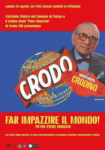 L’Archivio Storico del Comune di Parma, in collaborazione con il Centro Studi “Piero Ginocchi” di Crodo (VB), presenta la figura di Pietro (detto Piero) Ginocchi, nato a Parma nel 1901, imprenditore all’avanguardia che negli anni ’60, quale presidente delle Terme di Crodo Spa, ideò con l’enologo dott. Maurizio Gozzelino il Crodino®, l’aperitivo analcolico per eccellenza, oggi noto in tutto il mondo.
