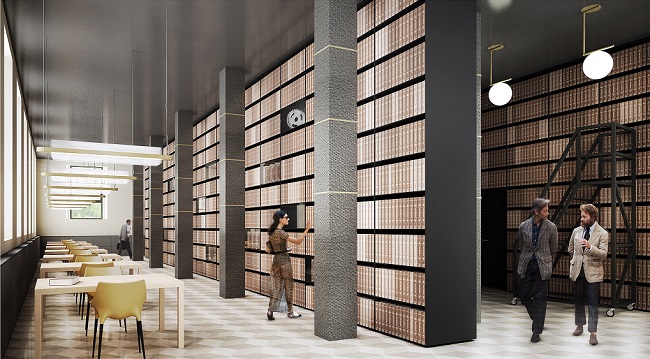 La biblioteca a piano terra, a sinistra rispetto all’ ingresso centrale, sarà di 242 metri quadri e altrettanto misurerà l’archivio, a destra, consentendo di custodire gli oltre 1.800 metri lineari di patrimonio in volumi dell’Istituto storico, ovviamente in costante aumento.