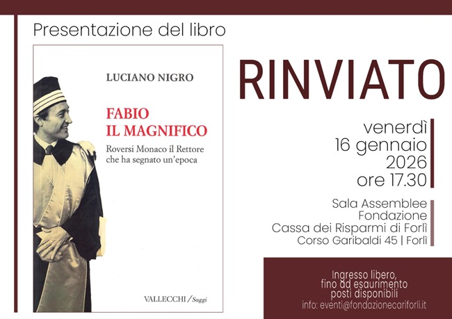 FORLÌ – La Fondazione Cassa dei Risparmi di Forlì desidera informare che l’incontro di presentazione del volume “Fabio il magnifico” di Luciano Nigro, previsto per Venerdì 16 gennaio 2026 presso la Sala Assemblee del Palazzo del Monte di Pietà, è stato rinviato a data da destinarsi.