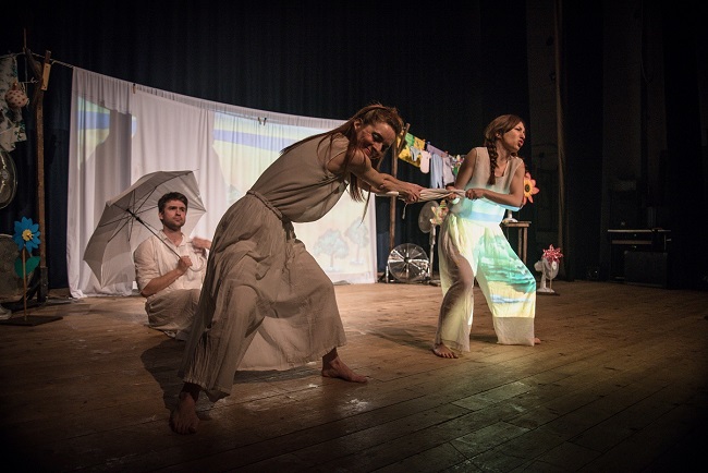 Con l’aiuto dei tre attori in scena, Piccolo Vento parla al pubblico, attirando l’attenzione dei bambini sull’osservazione delle piccole cose della natura e sull’ascolto del racconto musicale.