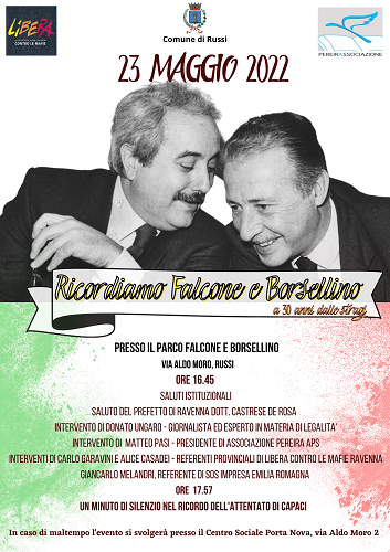 Anche quest’anno, quindi, lunedì 23 maggio a partire dalle 16.45 presso il parco Falcone e Borsellino, a Russi in via Aldo Moro 2, avranno luogo le celebrazioni di questa importante ricorrenza.