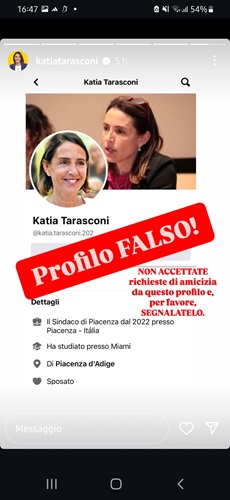 PIACENZA – La sindaca Katia Tarasconi invita tutti gli utenti di social network a non accettare richieste di amicizia – segnalandole invece alle autorità competenti con la motivazione “furto di identità” – dal profilo Facebook @katia.tarasconi.202, che riporta la sua immagine e l’indicazione “sindaco di Piacenza” ma è, in tutto e per tutto, un falso in alcun modo riconducibile o gestito da lei. “Ringrazio – spiega Tarasconi – le persone che mi hanno avvisata, tra cui alcuni cittadini che hanno chiamato in Comune stamattina per chiedere spiegazioni: avendo aderito a questa presunta richiesta di amicizia da parte del finto profilo, hanno iniziato a ricevere messaggi invasivi e poco chiari. Mi sono già rivolta alla Polizia Postale e delle Telecomunicazioni – rende noto la sindaca anche attraverso le sue vere pagine Facebook e Instagram – per denunciare questo fatto e un altro, grossolano tentativo di truffa via whatsapp, utilizzando il mio nome e addirittura quello della presidente del Consiglio Giorgia Meloni. Occorre molta attenzione, ma moltiplicando le segnalazioni possiamo contrastare questo odioso reato”.