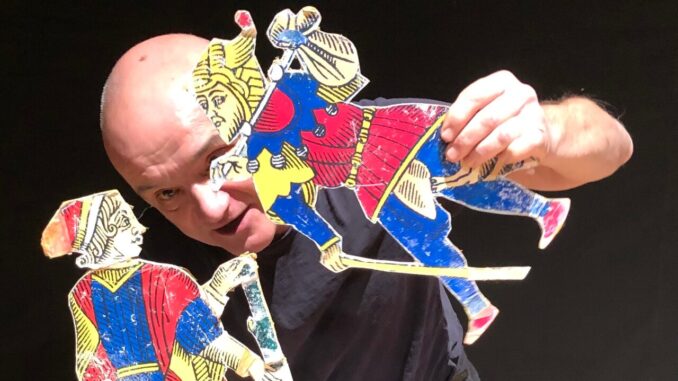L’idea di portare in scena uno spettacolo realizzato con delle figure di carta tratte da due mazzi di Tarocchi, quello Visconteo e quello più popolare di Marsiglia, nasce dalla lettura de “Il Castello dei destini incrociati” di Italo Calvino. Due sono le storie rappresentate che, tratte dalla raccolta Fiabe Italiane dell’autore citato, trovano nei simboli e nelle figure dei tarocchi i loro personaggi, e in comune hanno il protagonista: il Fante di Bastoni.