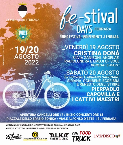FERRARA – Saranno gli spazi all’aperto di ‘Sonika’, sulle Mura estensi di viale Alfonso I d’Este a Ferrara, a fare da teatro venerdì 19 e sabato 20 agosto 2022 al ‘FE-stival Days’, ‘il primo festival indipendente ed emergente’ di musica, a cura del MEI-Meeting delle Etichette Indipendenti, con il sostegno del Comune di Ferrara.