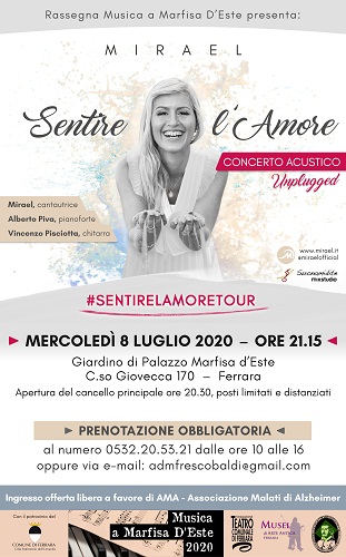 FERRARA – Mercoledì 8 Luglio 2020 alle ore 21.15 nel Giardino di Palazzo Marfisa d’Este, in c.so Giovecca 170 a Ferrara, la cantautrice ferrarese Mirael (www.mirael.it – @miraelofficial) presenterà alcune sue composizioni nel Concerto “Sentire l’Amore”, accompagnata da Alberto Piva al pianoforte e da Vincenzo Pisciotta alla chitarra, nell’ambito della Rassegna Musica a Marfisa d’Este a cura del Circolo Girolamo Frescobaldi “Amici della Musica” con il patrocinio del Comune di Ferrara e il sostegno del Teatro Comunale di Ferrara (posti limitati, prenotazione obbligatoria al tel. 0532-205321 o all’indirizzo admfrescobaldi@gmail.com).