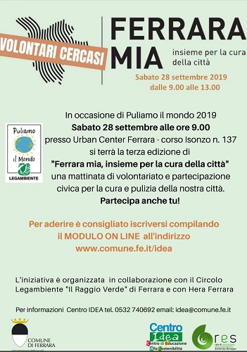 LA SCHEDA a cura di Centro Idea del Comune di Ferrara – Siamo giunti ormai alla 3^ edizione di “Ferrara mia, Insieme per la cura della città” l’appuntamento organizzato dal Comune di Ferrara per sabato 28 settembre, dalle 9 alle 13, in collaborazione con il circolo di Legambiente ‘il Raggio Verde’ e con Hera Ferrara, nell’ambito di Puliamo il Mondo, l’edizione italiana di ‘Clean up the World’ – il più grande appuntamento di volontariato ambientale del mondo.
