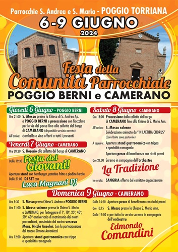 POGGIO TORRIANA (RN) – Ritorna la Festa della Comunità Parrocchiale di Poggio Berni e Camerano, che da due anni è stata spostata nel mese di giugno rispetto alle tradizionali date di settembre.