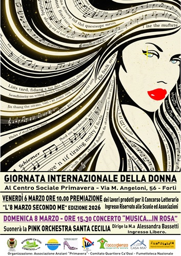 A conclusione degli eventi progettati, in omaggio alle donne, DOMENICA 8 MARZO ORE 15.30 al Centro Sociale Primavera di via M.Angeloni, 56, Forlì, ci sarà il CONCERTO intitolato “Musica…in rosa” eseguito dalla nota PINK ORCHESTRA SANTA CECILIA , diretta dalla Maestra Alessandra Bassetti. INGRESSO LIBERO