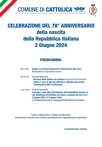 CATTOLICA (RN) – Festa della Repubblica 2024, le celebrazioni in piazza Roosevelt con la consegna di copia delle Costituzioni ai neo diciottenni di Cattolica. Tutto è pronto per la ricorrenza di domani, sabato 2 giugno.