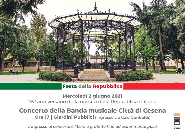 CESENA – In occasione del 75esimo anniversario dalla nascita della Repubblica Italiana, torna a Cesena il concerto del 2 giugno, occasione importante di riflessione su cosa è e su cosa vuole essere la Repubblica oggi. Dopo la sospensione dello scorso anno di tutti gli eventi in presenza a causa dell’emergenza sanitaria, mercoledì 2 giugno sarà riproposto alla cittadinanza il tradizionale appuntamento musicale che avrà luogo presso i Giardini pubblici cittadini.