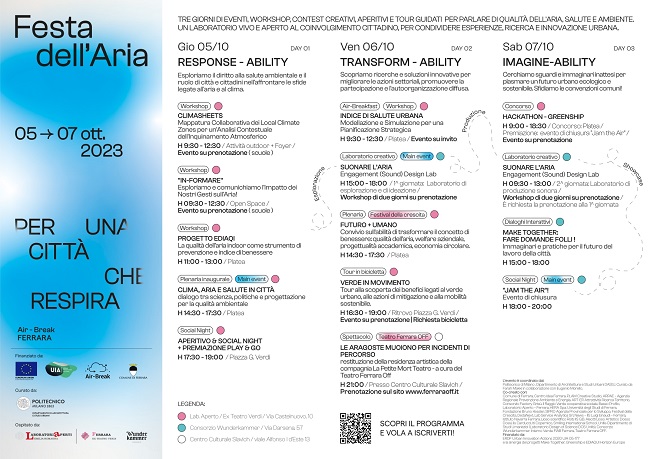 FERRARA – Ritorna a Ferrara la “Festa dell’aria”, l’iniziativa dedicata alla qualità dell’aria e del clima con un programma di eventi sui temi della salute e salubrità urbana, con attività, seminari e incontri di condivisione scientifica a favore della qualità ambientale. L’iniziativa – alla 3.a edizione – è in programma da giovedì 5 a sabato 7 ottobre 2023. Le attività verranno organizzate nelle sedi del Laboratorio Aperto (via Castelnuovo 10, Ferrara) e del Consorzio Wunderkammer (via Darsena 57, Ferrara) con spettacolo al Teatro Ferrara Off (via Alfonso I d’Este 13, Ferrara).