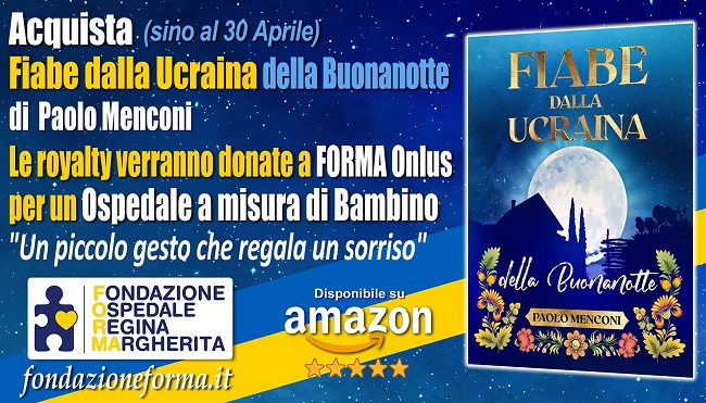 P.M.: Sino al 30 Aprile 2022 per ogni libro acquistato (su Amazon), de “Fiabe dalla Ucraina della Buonanotte” di Paolo Menconi, le royalty verranno interamente devolute alla Fondazione FORMA OnLus dell’Ospedale Regina Margherita di Torino che, con il suo importante lavoro, lavora quotidianamente per un “Ospedale a misura di Bambino”: un modo quindi per fondere la magia delle fiabe con la concretezza del lavoro di FORMA OnLus. Mi auguro che, in momenti così complessi e difficili, queste fiabe possano contribuire a regalare alcuni attimi di gioia e di serenità a tutti: grandi e bambini.