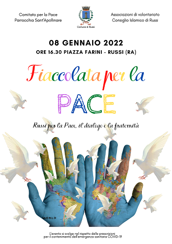 RUSSI (RA) – In programma per sabato 8 gennaio 2022 la “Fiaccolata per la pace” a favore della non violenza e della fraternità, con ritrovo in piazza Farini alle 16.00, partenza davanti all’albero di Natale alle 16.30 e proseguimento per le vie del centro. Alla fiaccolata seguirà un incontro davanti alla sede della Pubblica Assistenza (piazza Farini 37) durante il quale interverranno il Sindaco di Russi Valentina Palli, Don Pietro Scalini e Ayoub El Rhalimi in qualità di rappresentante del Consiglio Islamico. Ad animare l’appuntamento del tardo pomeriggio ci saranno brani musicali e letture mentre per deliziare il palato saranno serviti dolci e tè offerti da Bartoletti Gianfranco.